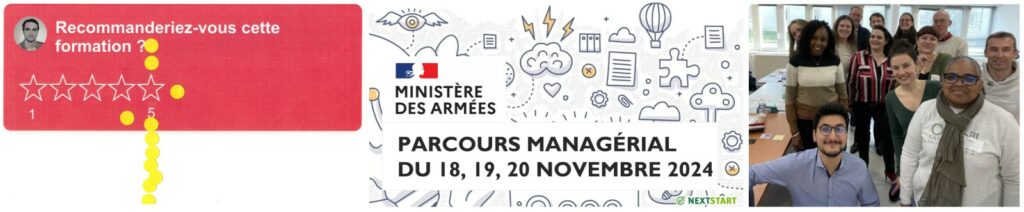 Ministère des Armées : Conception et animation d’un séminaire RH avec 80 personnes. Accueil des nouveaux arrivants, quiz de connaissances avec 20 questions live sur téléphone mobile, activité de cohésion avec le « Marshmallow Challenge » en 16 équipes de 5…